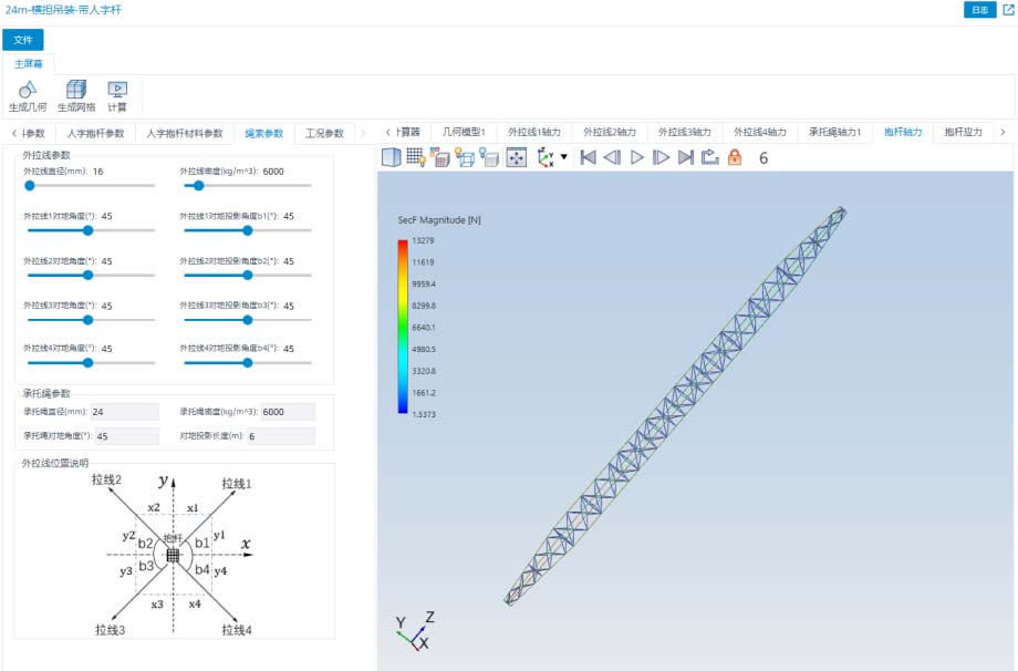 - 可實現抱桿的快速建模,對抱桿截面、等邊角鋼截面、抱桿材料、繩索參數以及工況條件進行參數化建模計算;通過豐富的可視化后處理技術,對抱桿的受力情況進行精準可靠的分析。