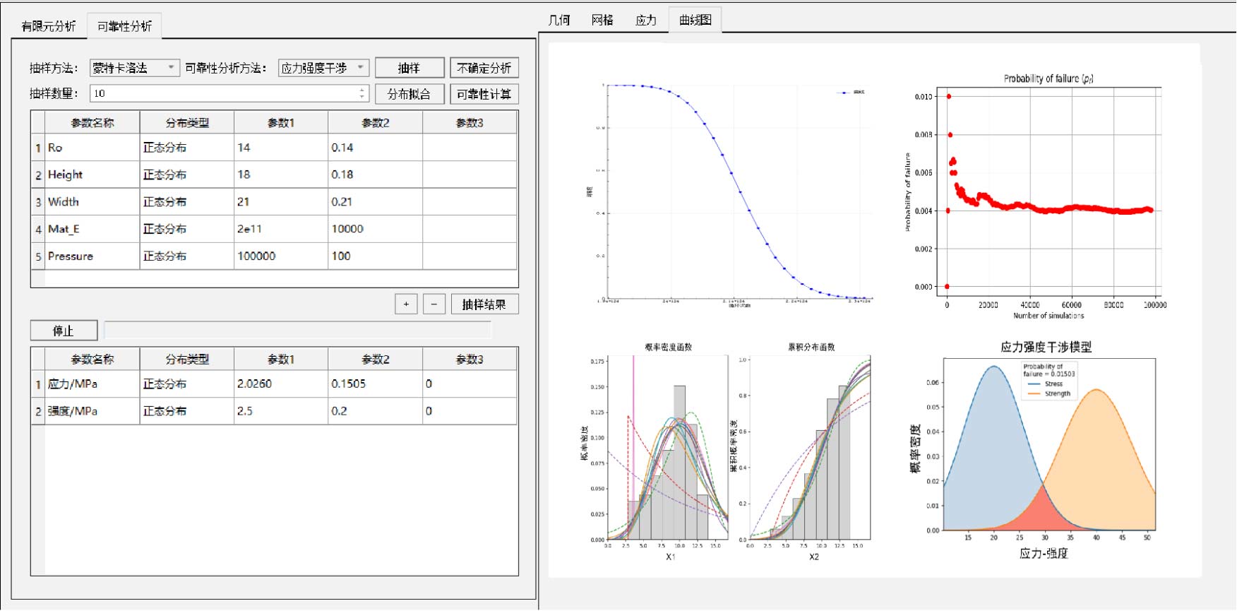 - 單元可靠性分析,包括不確定分析與可靠性分析。不確定分析是對單元的幾何參數、材料參數、工況載荷等不確定因素進行不確定分析;可靠性分析是基于不確定分析生成的樣本空間,對單元進行有限元分析迭代分析,獲得仿真響應量的樣本空間,在此基礎上調用故障機理模型進行可靠性分析,獲得不同故障機理模型下的可靠度、疲勞壽命。